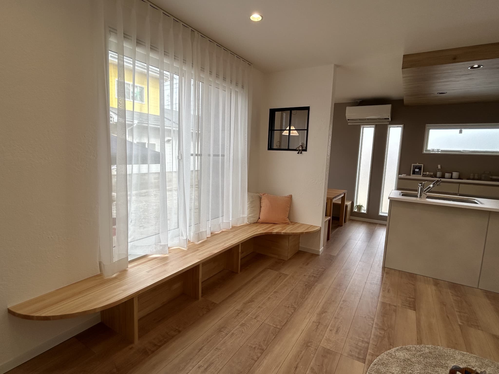 やわらかな曲線を描くベンチは、窓辺に寄り添う特別な居場所。差し込む光を感じながら本を読んだり、ちょっとしたお昼寝もできる心地よさ。家族の会話も自然と集まり、リビングにもう一つのくつろぎ空間が生まれます。シンプルでいてデザイン性も高く、お部屋のアクセントに。「座りたい」と思わせる、暮らしに馴染むベンチです。