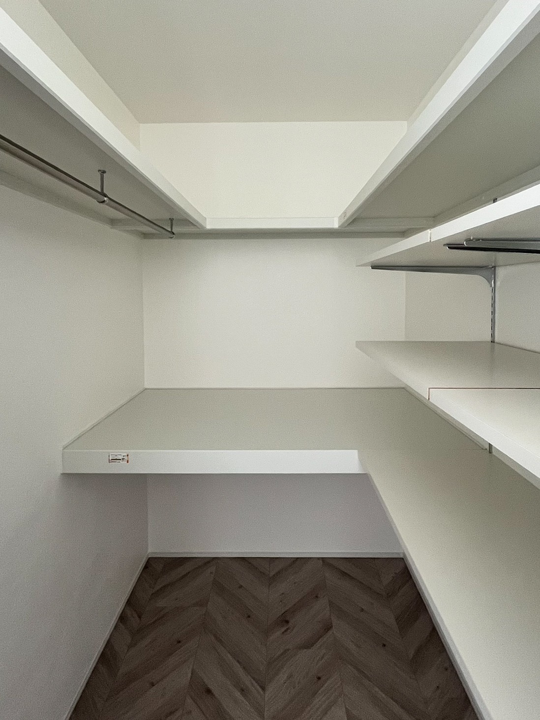 ウォークインクローゼットは仕舞うものにあわせて棚板やハンガーパイプを設置。季節の衣類はもちろん、小物やバッグもすっきりと美しく収まります。上下の空間を活かした枕棚とハンガーパイプで、収納力も抜群。忙しい朝も、気分に合わせてコーディネートを選ぶ時間が楽しくなります。お気に入りの洋服に囲まれて、毎日を彩る特別な空間を作ってみませんか? -