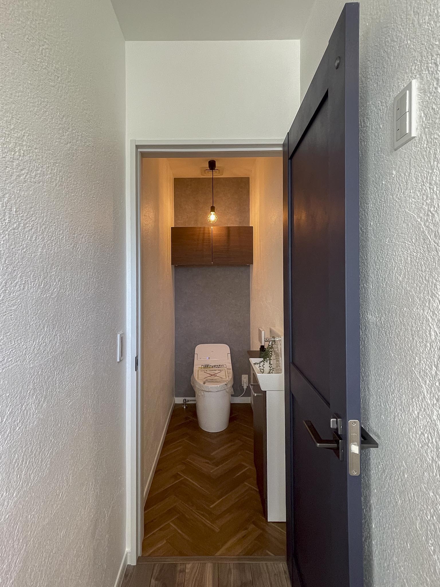 コンパクトな空間にこそ映える、照明と素材のコントラスト。グレーのアクセントクロスに、あたたかな光が落ちて心地よさを演出。木目のキャビネットが、シンプルな中にぬくもりを添える。日常にリラックスできる空間に、ちょっと特別に感じさせてくれるトイレです。 -