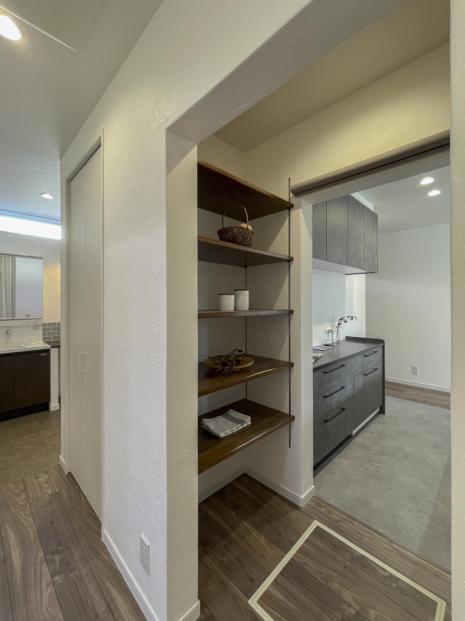 家事の動線をスムーズにする平屋の回遊動線。キッチンからの洗濯脱衣室やファミリークローゼットへのアクセスもスムーズ。日々の家事の負担を軽くして、自分の時間を作ることができます。