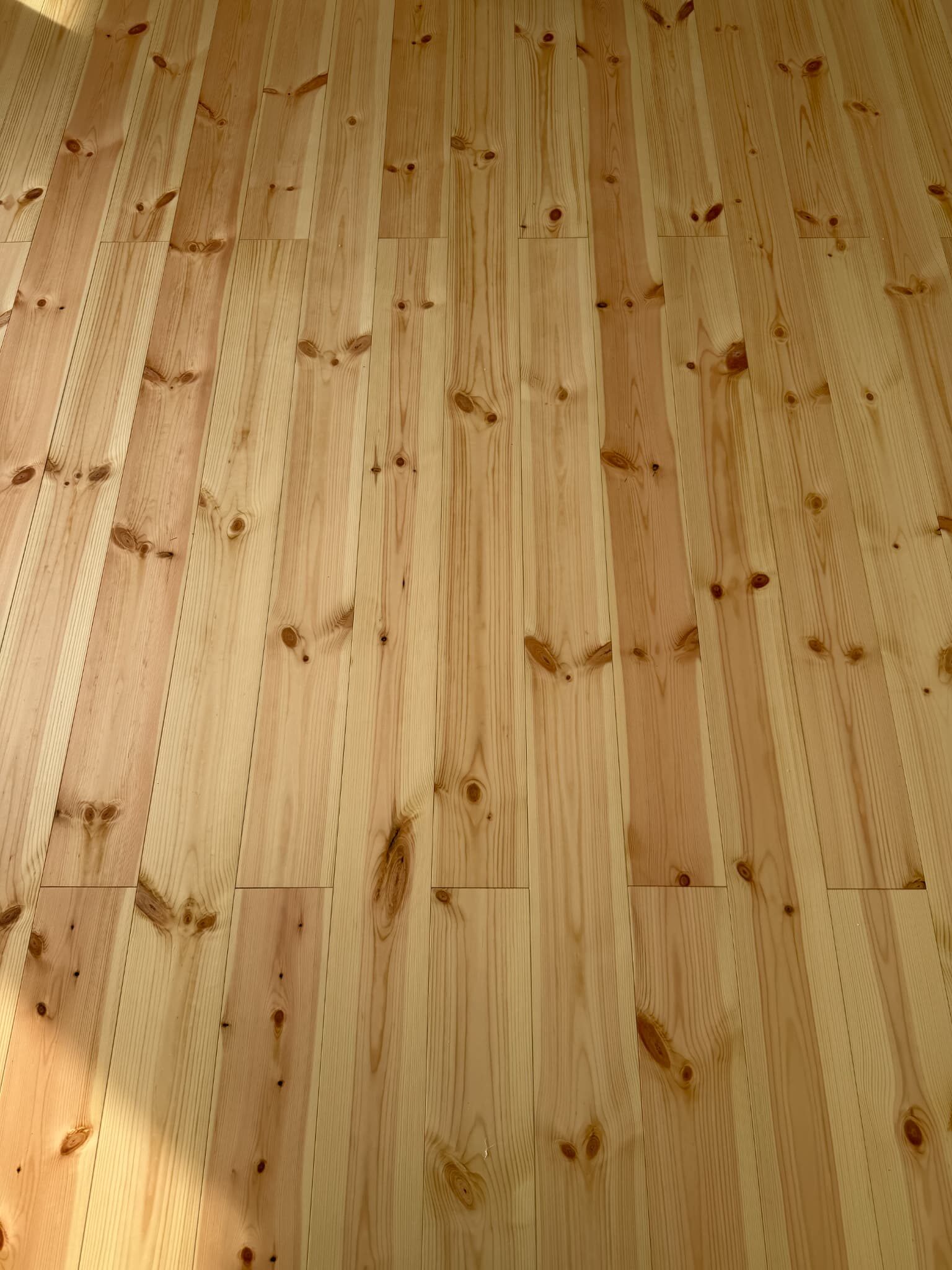 床一面に広がる柔らかな木目が美しい無垢のパイン材。本物の木だけが持つ温もりと、肌触りが優しい、心地よい感触が魅力です。時間とともに深まる風合いと、自然素材がもたらす調湿効果が、家族を包み込む安らぎの空間を作り上げます。 -